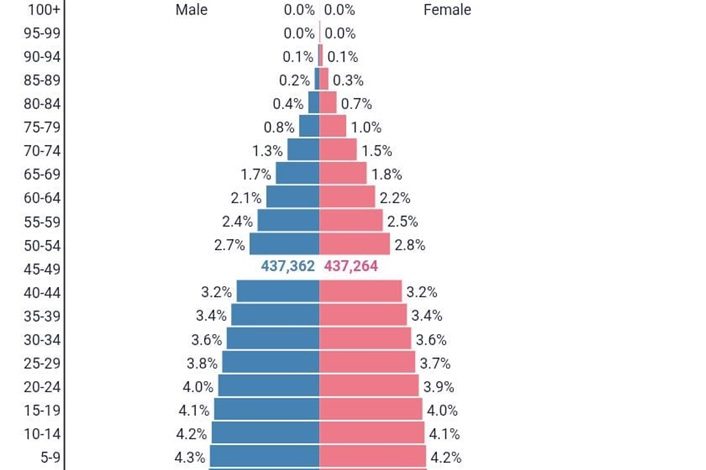 La part des personnes âgées restera faible. Les projections indiquent que la tranche des 90 à 95 ans représentera 0 % de la population totale. Toutefois, une légère surreprésentation féminine est attendue chez les personnes âgées de plus de 80 ans (0,3 % contre 0,2 % pour les hommes), confirmant une espérance de vie plus élevée chez les femmes.