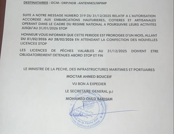 Le ministère des pêches des infrastructures maritimes et portuaires a décidé de rallonger automatiquement les licences pour les embarcations de pêche hauturière, côtière et artisanale pour tout le mois de février après l’expiration d’un premier délai fixé au 31 janvier 2026.